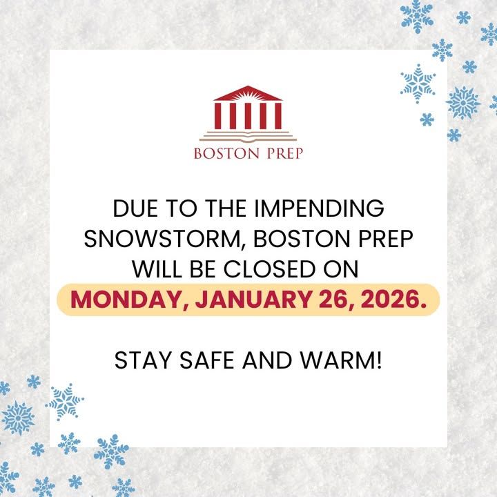 Due to the impending snowstorm, Boston Prep will be closed on Monday, January 26, 2026.