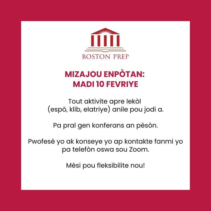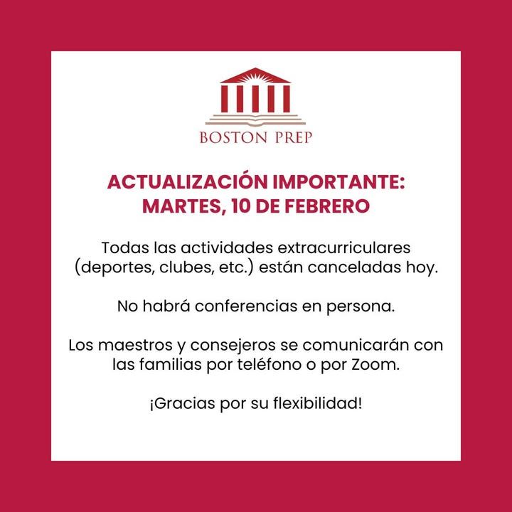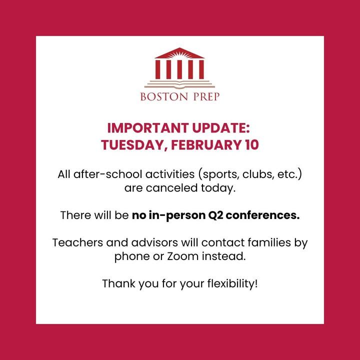 Dear Boston Prep Community: all after-school activities (sports, clubs, etc.) are canceled today, 2/10/26.