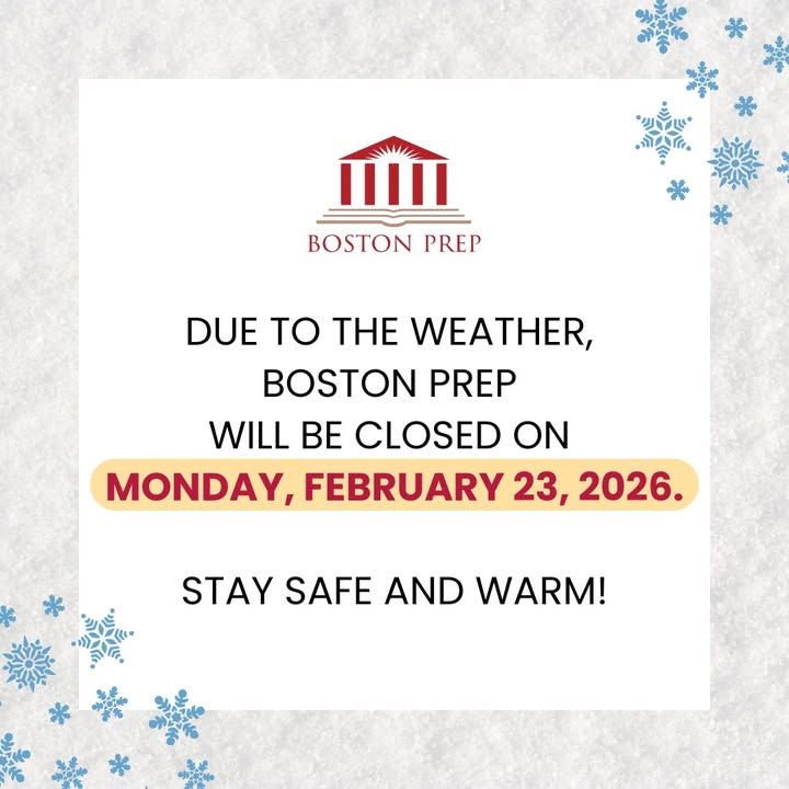 Due to the weather, Boston Prep will be closed on Monday, February 23, 2026.