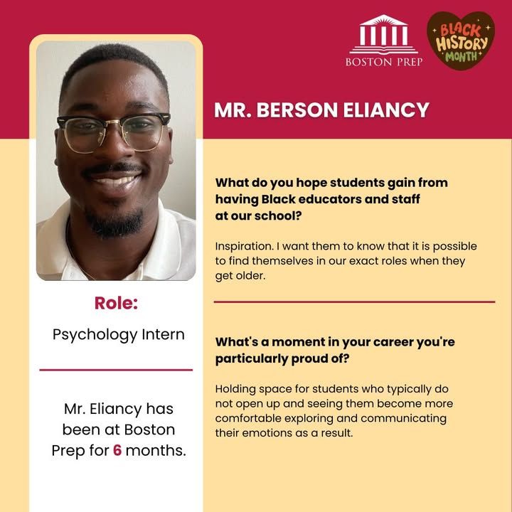 We’re proud to spotlight Mr. Berson Eliancy, our Psychology Intern, who has been part of the Boston Prep community for the past 6 months! Mr. Eliancy hopes students see themselves reflected in the educators around them and feel inspired to imagine their own futures in these very roles. Thank you for the empathy and dedication you bring to our community! ❤️💛