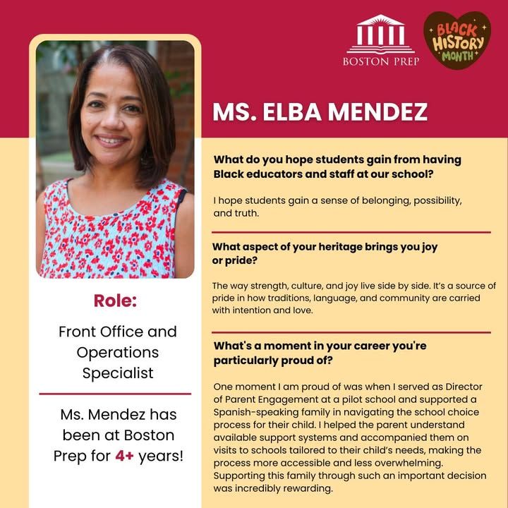 We’re proud to spotlight Ms. Elba Mendez, our Front Office & Operations Specialist, who has been part of the Boston Prep community for over 4 years! Ms. Mendez hopes students gain a sense of belonging, possibility, and truth when they see Black educators and staff in our school.