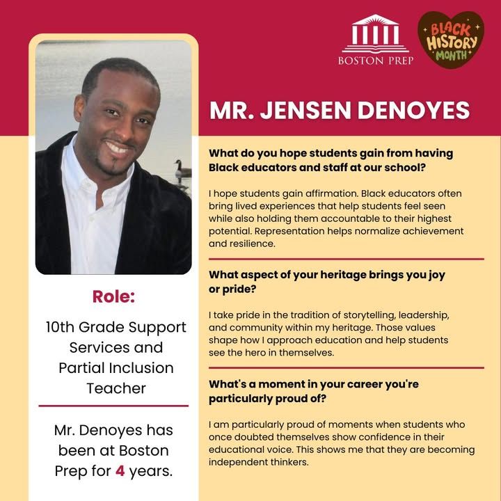 We’re proud to spotlight Mr. Jensen Denoyes, our 10th Grade Support Services & Partial Inclusion Teacher, who has been part of the Boston Prep community for 4 years! We’re grateful for the care, accountability, and belief he pours into our scholars each day, and for the way he draws on traditions of storytelling, leadership, and community to help students see the hero within themselves. ❤️💛